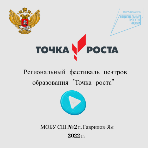 22 ноября 2022 года были подведены итоги Регионального фестиваля центров образования «Точка Роста». Целью данного мероприятия было выявление, обобщение и распространение передового педагогического опыта и лучших практик центров образования «Точка Роста». В ходе фестиваля были продемонстрированы 87 видеороликов школ Ярославской области, где наша школа заняла почётное 4 место. Это событие дало возможность педагогам получить ценные знания и опыт для дальнейшего внедрения в образовательную деятельность наиболее эффективных педагогических технологий, форм, методов и приемов обучения с целью достижения лучших образовательных результатов обучающимися центров «Точка роста».